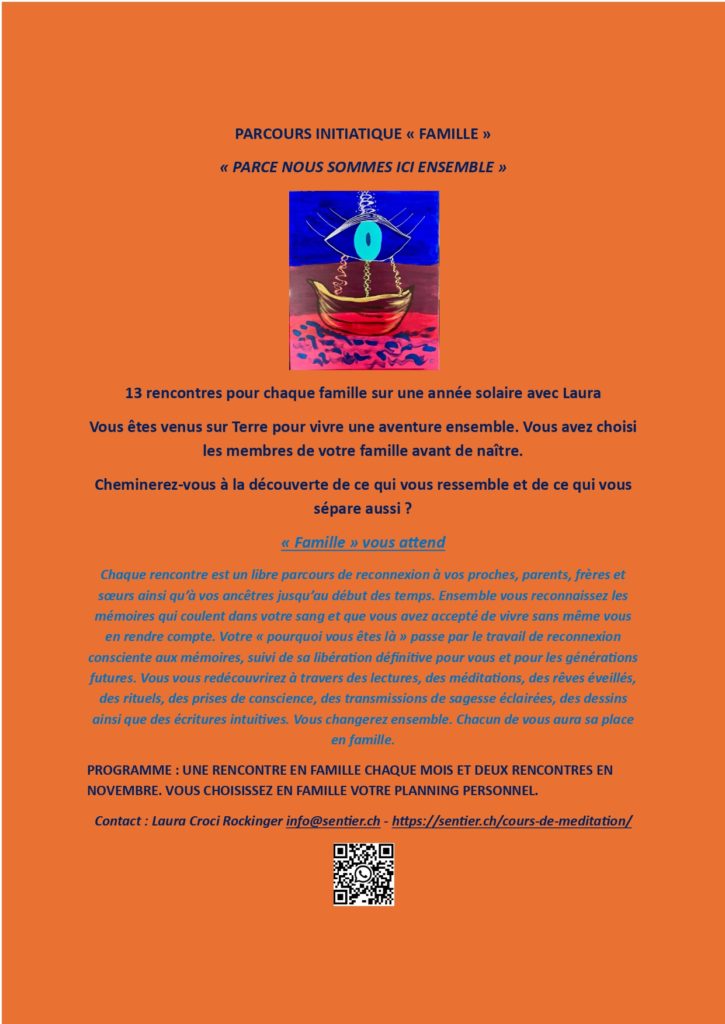 Famille : 13 rencontres pour chaque famille sur une année solaire avec Laura. Vous êtes venus sur Terre pour vivre une aventure ensemble. Chaque rencontre est un libre parcours de reconnexion à vos proches, parents, frères et sœurs ainsi qu’à vos ancêtres jusqu’au début des temps. Ensemble vous reconnaissez les mémoires qui coulent dans votre sang et que vous avez accepté de vivre sur Terre. Vous changerez ensemble pour les générations futures, pour vous.